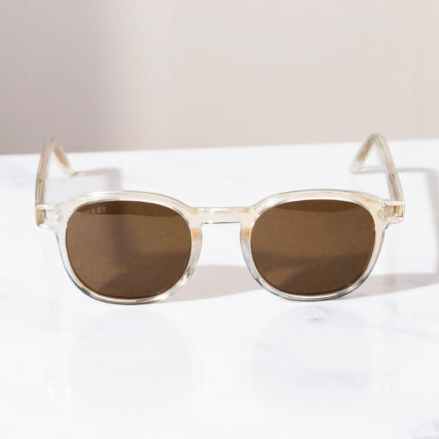 نظارات شمسية بإطار Panto بلون بيج كريستالي مستوحى من أجواء السواحل. تتميز هذه النظارات بتصميم أنيق بإطار شفاف بلون البيج يمنحك طابعاً عصرياً وهادئاً يناسب النزهات، السفر، وأيام الصيف المشمسة