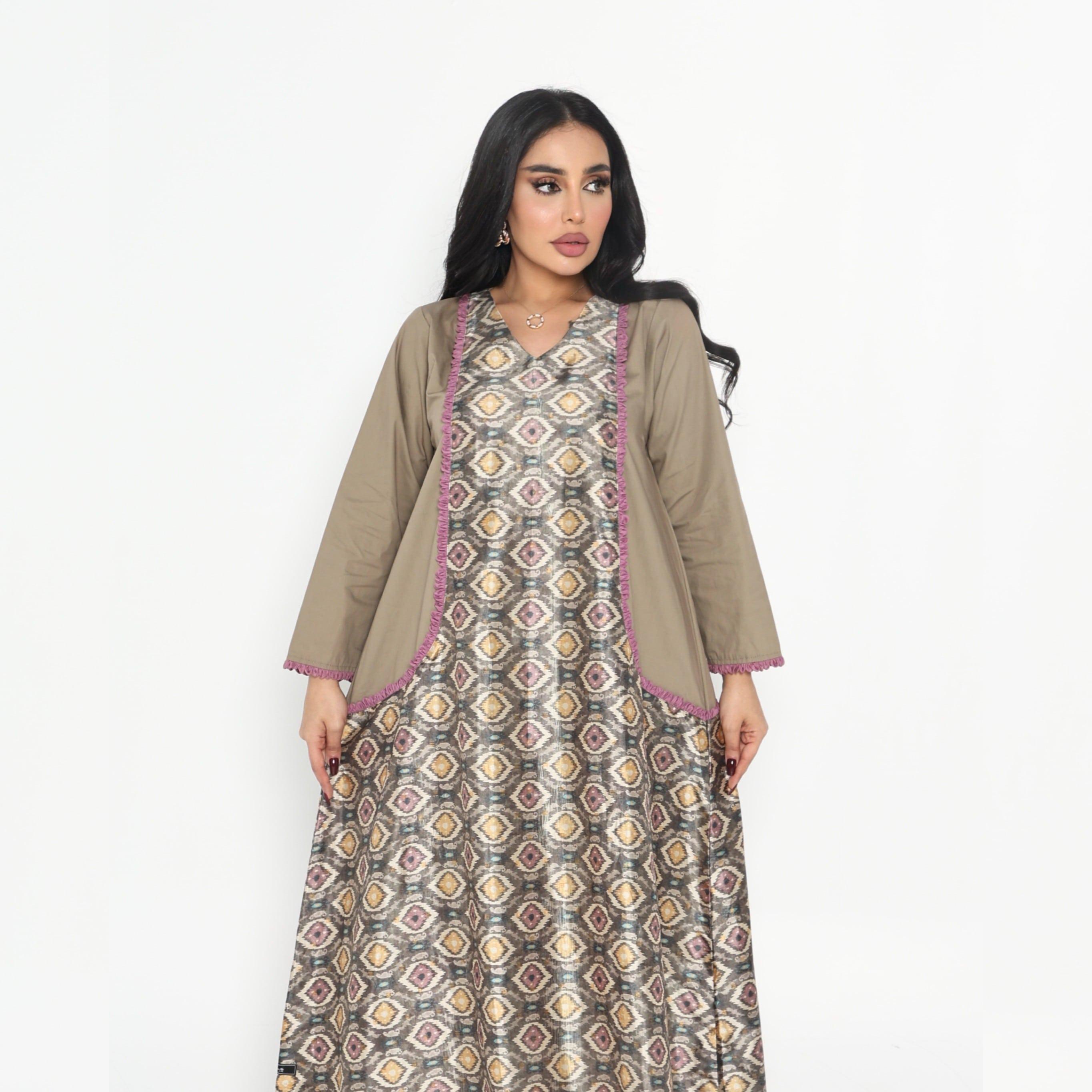 أضيفي لمسة من الأناقة مع توب الساتان المطبوع وعباية مفتوحة بسيطة، المصممة للمرأة العصرية التي تبحث عن الراحة والأناقة معاً. يتسم هذا التصميم الفاخر باللون الزيتوني مع تفاصيل الحواف الموف، مما يوفر مظهراً أنيقاً وجذاباً يناسب جميع الأوقات